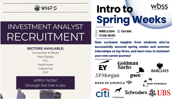 WBS의 공식적으로 소속되어 있지는 않지만 협력관계를 맺으며 많은 도움을 받을 수 있는 동아리들도 존재합니다. 저는 가끔 수업보다 동아리 활동을 통해 얻어 가는 게 정말 많다는 생각을 할 때도 있습니다. CV, Cover Letter, interview clinic과 같이 취업에 실질적으로 도움이 되는 세션들, 각 동아리를 스폰서 하는 기업들에서 오는 초청 강연, 금융 분야에 대한 기본적인 지식을 함양할 수 있게 도와주는 시간들 그리고 실제로 유명한 기업들에서 spring week, summer internship 혹은 placement year를 하신 선배님들과 친해질 수 있는 네트워킹 시간까지 정말 다양한 이벤트들이 있습니다. 저는 운이 좋게 Hedge Fund Society에서 하는 Investment Analyst 프로그램에 합격해서 열심히 배우고 있습니다.